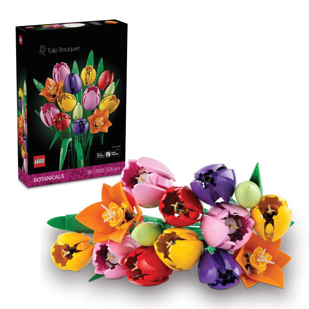 18 years & up. Create a beautiful floral display with the LEGO® Botanicals Tulip Bouquet building kit. Inspired by the beauty and optimism of spring, this set features five varieties of tulips in vibrant colors and different stages of bloom, including green buds, purple closed tulips, and red, yellow, pink, and orange open tulips, along with detailed green leaves for a realistic touch. Adjustable stems allow you to arrange the flowers into a customized bouquet, which becomes a striking piece of home décor once completed. Set includes 576 pieces.