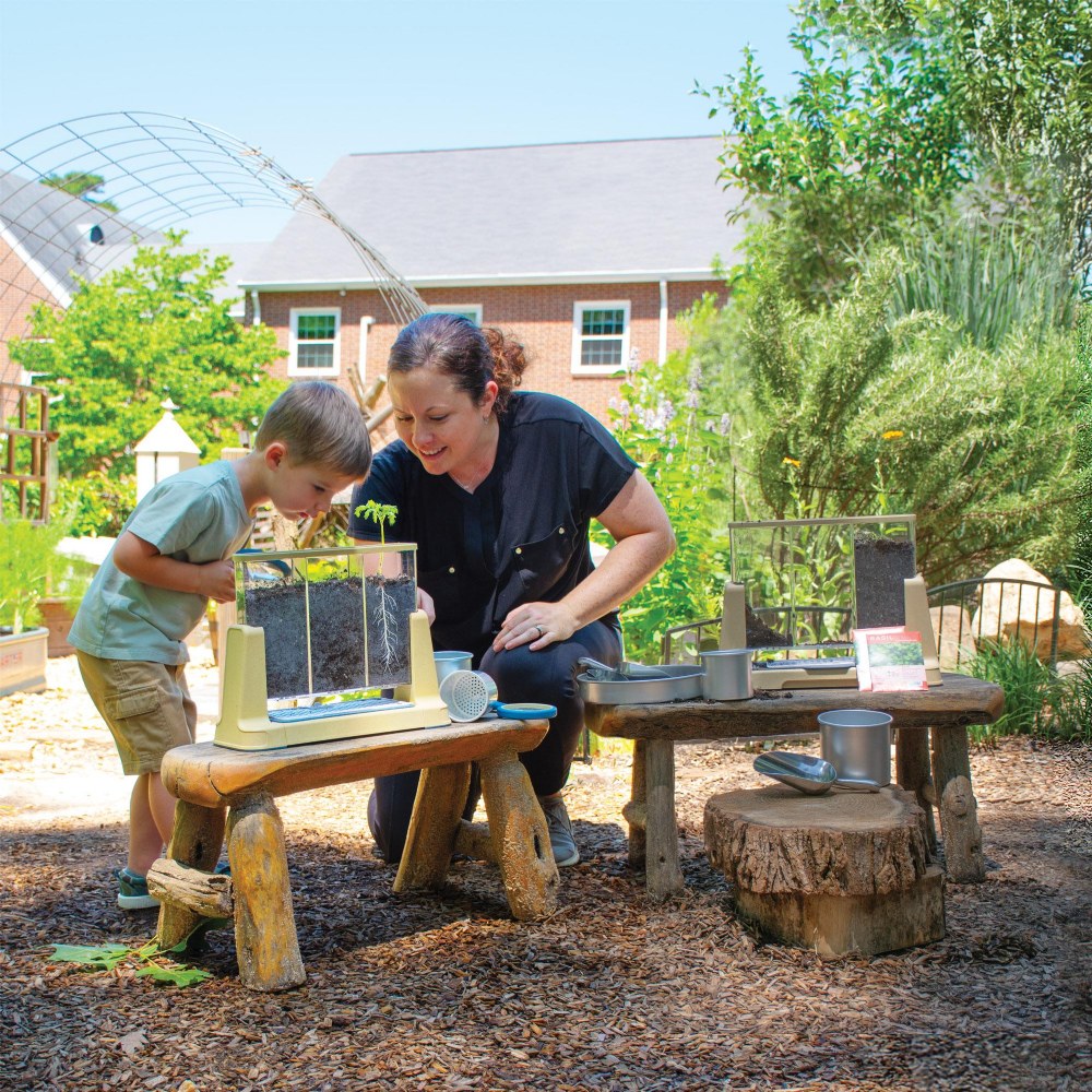 3 years & up. When children are provided with rich materials and authentic science tools, their desire for discovery flourishes. The Explore and Discover 3 Section Root View Planter gives young children a chance to grow their own plants, and observe, measure, and track their progress from seedling to full-grown plant. Store the included tools conveniently in the compartment under the planter when not in use. Planter features 3 sections for 3 different plants, or a comparison of 3 of the same plants with different variables for enhanced experiments. Easily remove the planter from the convenient stand for hands-on activities. Measures 14"W x 11"H x 4"D.