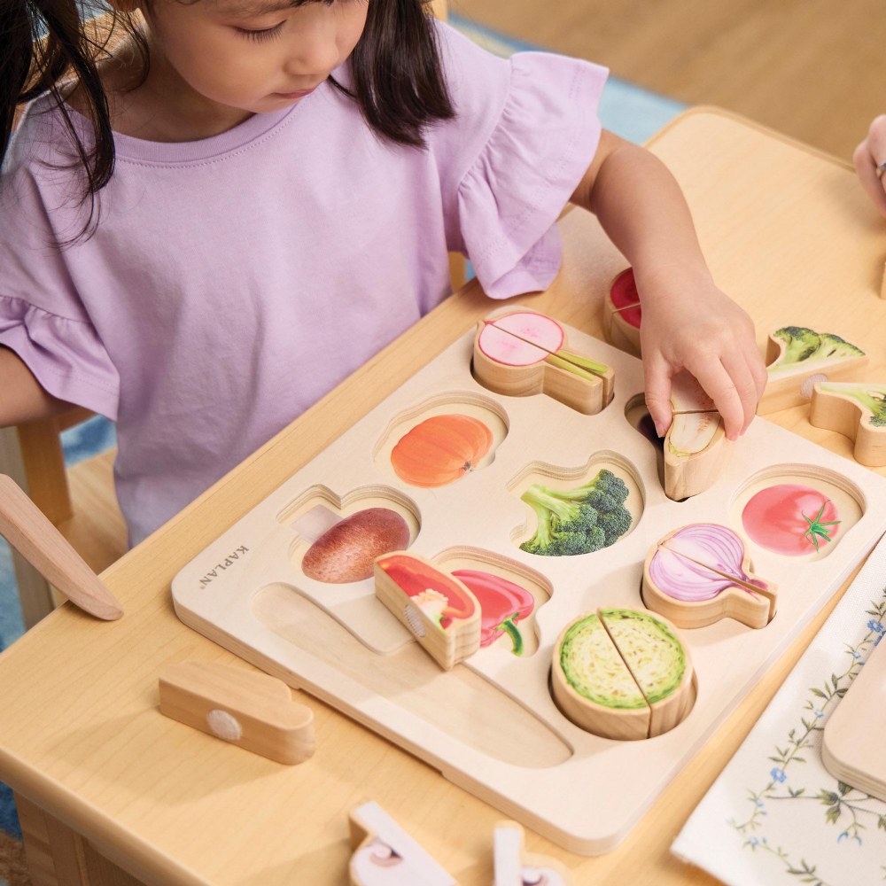 18 months & up. Encourage children to learn about shapes, identify various vegetables, and engage in conversations about healthy foods using this durable wooden puzzle. Includes 9 vegetables, a wooden cutting board with beautifully printed images, and a wooden knife. Puzzle board measures 10.5"L x 9.5"W x .4"H.