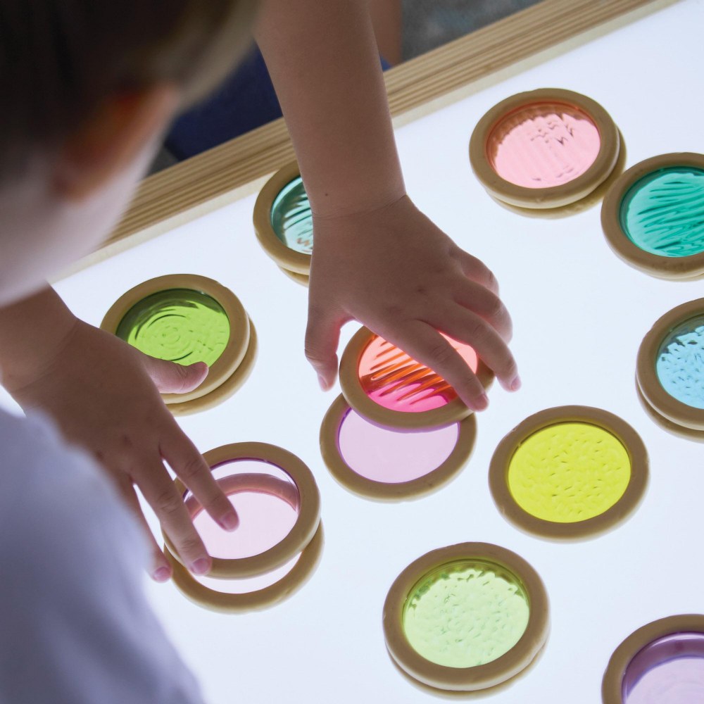 18 months & up. When provided with rich, beautiful materials, the possibilities for discovery are multiplied. This set of translucent discs encourages children's relationships with nature through organic patterns and colors. Durable enough for continued use indoors or outdoors, this 20-piece set interacts beautifully with natural light or light tables, and is the perfect addition to loose parts play. Children can work on patterning, color recognition, and seriation as well as engage in tactile exploration. Each disc measures 2.8" in diameter.