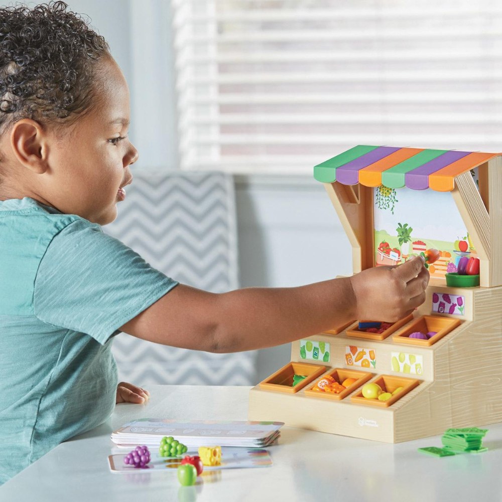 3 years & up. This farmstand is packed with hands-on learning fun! Kids can use 6 removable sorting baskets to fill orders from a 30-piece assortment of adorable farm-to-table items such as fruits, veggies, baked goods, jams, flowers, and more. It also includes kid-sized play money to help build fine motor skills through imaginative play. Activity cards offer even more learning opportunities! When playtime's over, all the pieces and cards store neatly inside the farmstand for quick and easy cleanup.