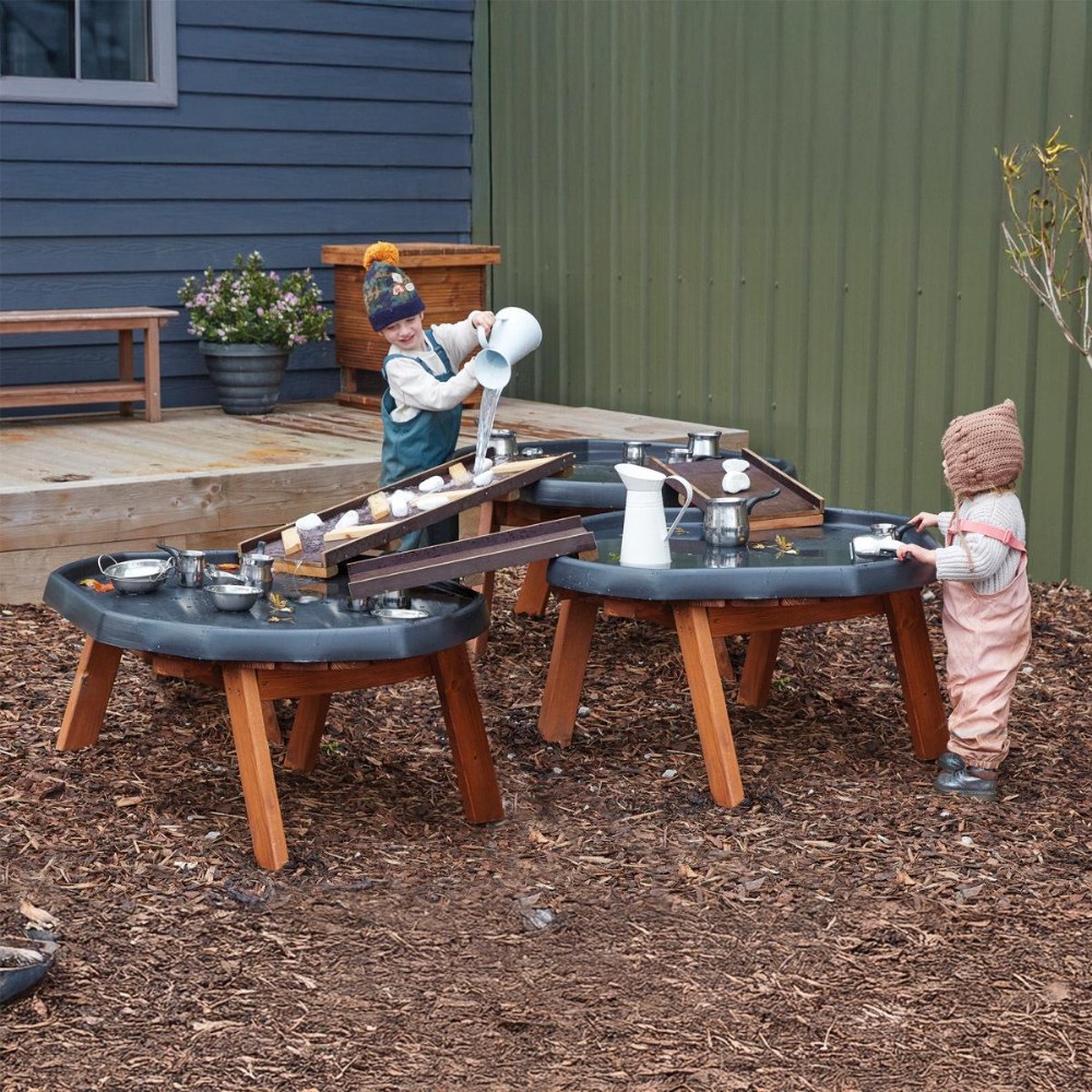 3 years & up. Our Tuff Spot Channels set is designed to support dynamic sensory and STEM activities. This set includes three wooden plank channels: one long zigzag channel and two shorter channels with dams, raised sides, and secure wooden stoppers. Ideal for use with water, sand, or loose parts, these channels encourage problem-solving, exploration, and the development of fine motor skills. A versatile addition to any sensory or outdoor play setup.