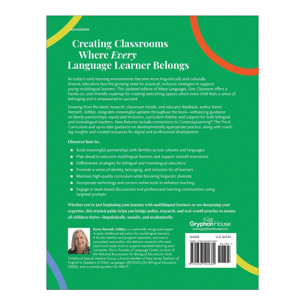 As today�s early learning environments become more linguistically and culturally diverse, educators face the growing need for practical, inclusive strategies to support young multilingual learners (MLLs). This extensively updated edition of Many Languages, One Classroom offers a hands-on, user-friendly roadmap for creating welcoming spaces where every child feels a sense of belonging and is empowered to succeed. Drawing from the latest research, classroom trends, and educator feedback, author Karen Nemeth, MEd, integrates meaningful updates throughout the book�enhancing guidance on family partnerships, equity and inclusion, curriculum fidelity, and support for both bilingual and monolingual teachers. New features also include connections to Connect4Learning® The Pre-K Curriculum and NAEYC�s most recent guidance on developmentally appropriate practice, along with updated terminology, coaching insights, and curated resources for digital and professional development.
