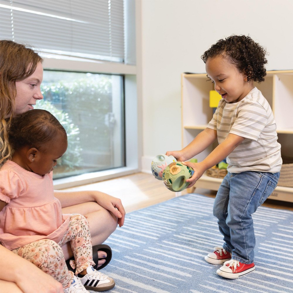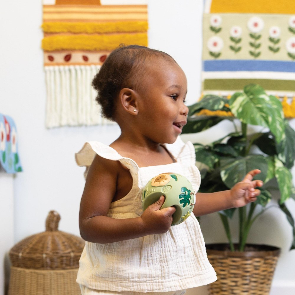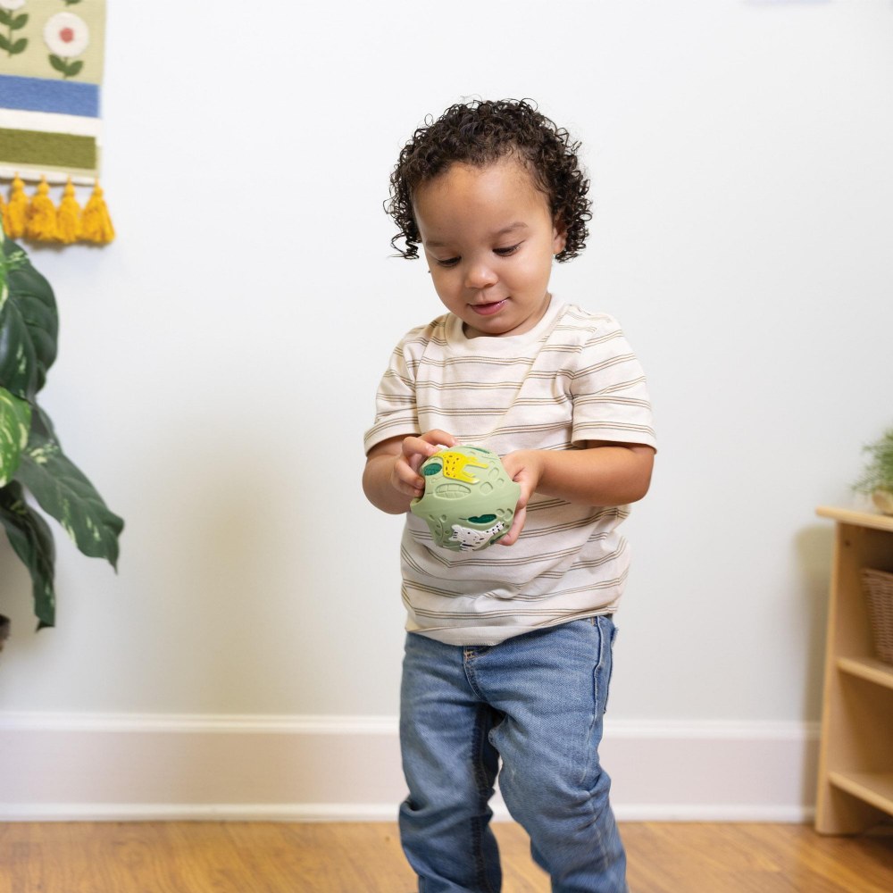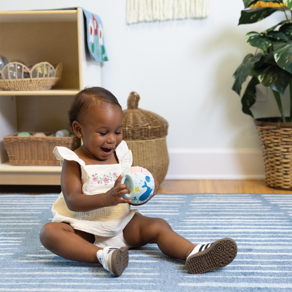 Birth & up. Designed to grow with your baby, our handcrafted grabbing balls are a thoughtfully made early learning toy that supports sensory development and encourages exploration from day one. Made from safe, natural materials, it's the perfect first toy for curious little hands. With the soft, tactile construction and vibrant, eye-catching colors, the balls stimulate multiple senses at once-inviting babies to reach, grasp, and engage. Whether discovering the depths of the sea or embarking on a safari adventure, the playful themes inspire imagination while supporting visual tracking, fine motor skills, and sensory awareness. A gentle introduction to hands-on learning, this durable, multi-sensory toy is ideal for tummy time, floor play, and developmental milestones. These balls are an all-in-one teether, rattler, or bath toy. Each ball is 3.8"H. Colors may vary.