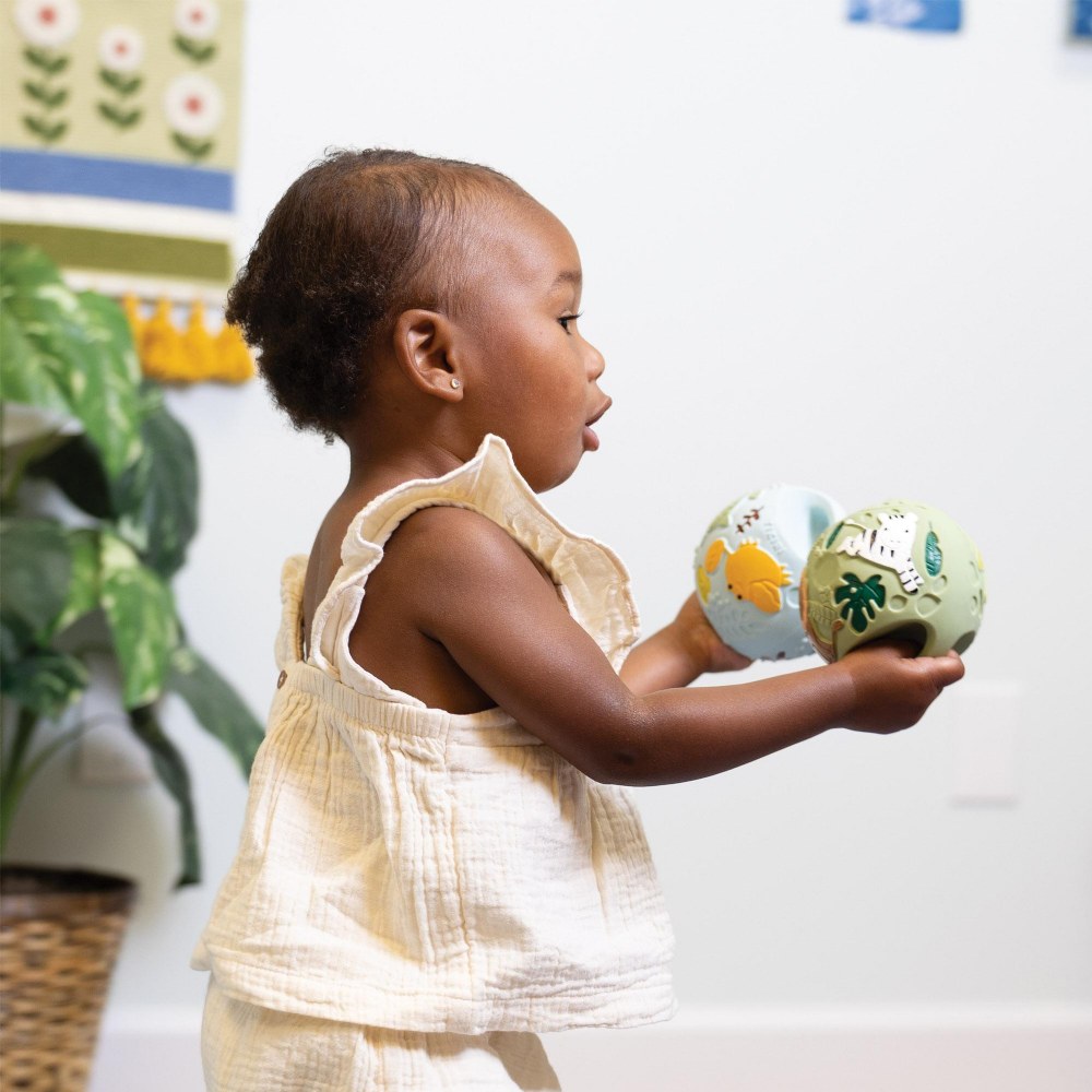 Birth & up. Designed to grow with your baby, our handcrafted grabbing balls are a thoughtfully made early learning toy that supports sensory development and encourages exploration from day one. Made from safe, natural materials, it's the perfect first toy for curious little hands. With the soft, tactile construction and vibrant, eye-catching colors, the balls stimulate multiple senses at once, inviting babies to reach, grasp, and engage. Whether discovering the depths of the sea or embarking on a safari adventure, the playful themes inspire imagination while supporting visual tracking, fine motor skills, and sensory awareness. A gentle introduction to hands-on learning, this durable, multi-sensory toy is ideal for tummy time, floor play, and developmental milestones. These balls are an all-in-one teether, rattler, or bath toy. Set includes one Safari-themed and one Ocean-themed grabbing ball. Each ball measures 3.8"H. Colors may vary.