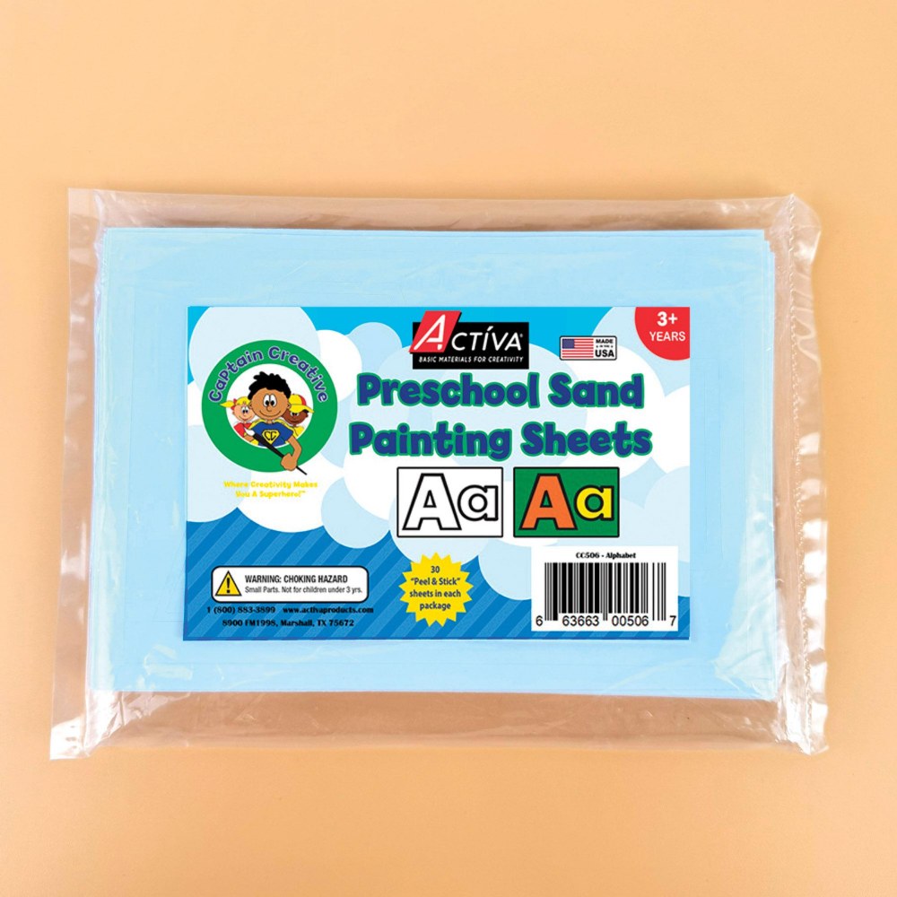 3 years & up. Encourage hands-on learning and creativity with these 5" x 7" Alphabet-Themed Sand Art Sticker Sheets! Each pack includes 30 sheets-one for every letter of the alphabet with uppercase and lowercase displayed together, plus four extra vowel sheets. Just peel, sprinkle with colored sand, press, and brush away the extra to bring each letter to life with texture and color.