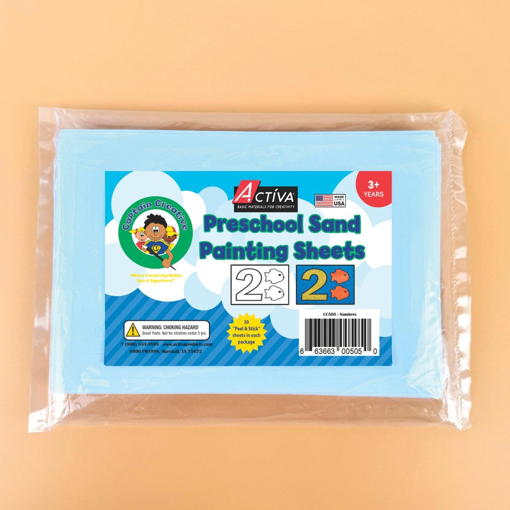 3 years & up. Inspire hours of creative fun with sand art! The set of six one-pound tubs of vibrant colored sand in Bright Red, Orange, Bright Yellow, Vivid Green, Dark Blue, and Purple, provide plenty of material for classroom projects, art centers, or home activities. Also available are a variety of themed sand painting sheets - letters, numbers, and bugs - designed to engage children in hands-on learning. Each sheet features peel-and-sand sections that allow little hands to sprinkle, press, and brush away excess sand to reveal colorful designs, helping to develop fine motor skills, hand-eye coordination, and creativity. Activa's high-quality colored sand is ACMI-approved and AP Non-Toxic, making it a safe and vibrant choice for young artists. Perfect for individual or group projects, this set provides endless opportunities for imaginative, educational play.