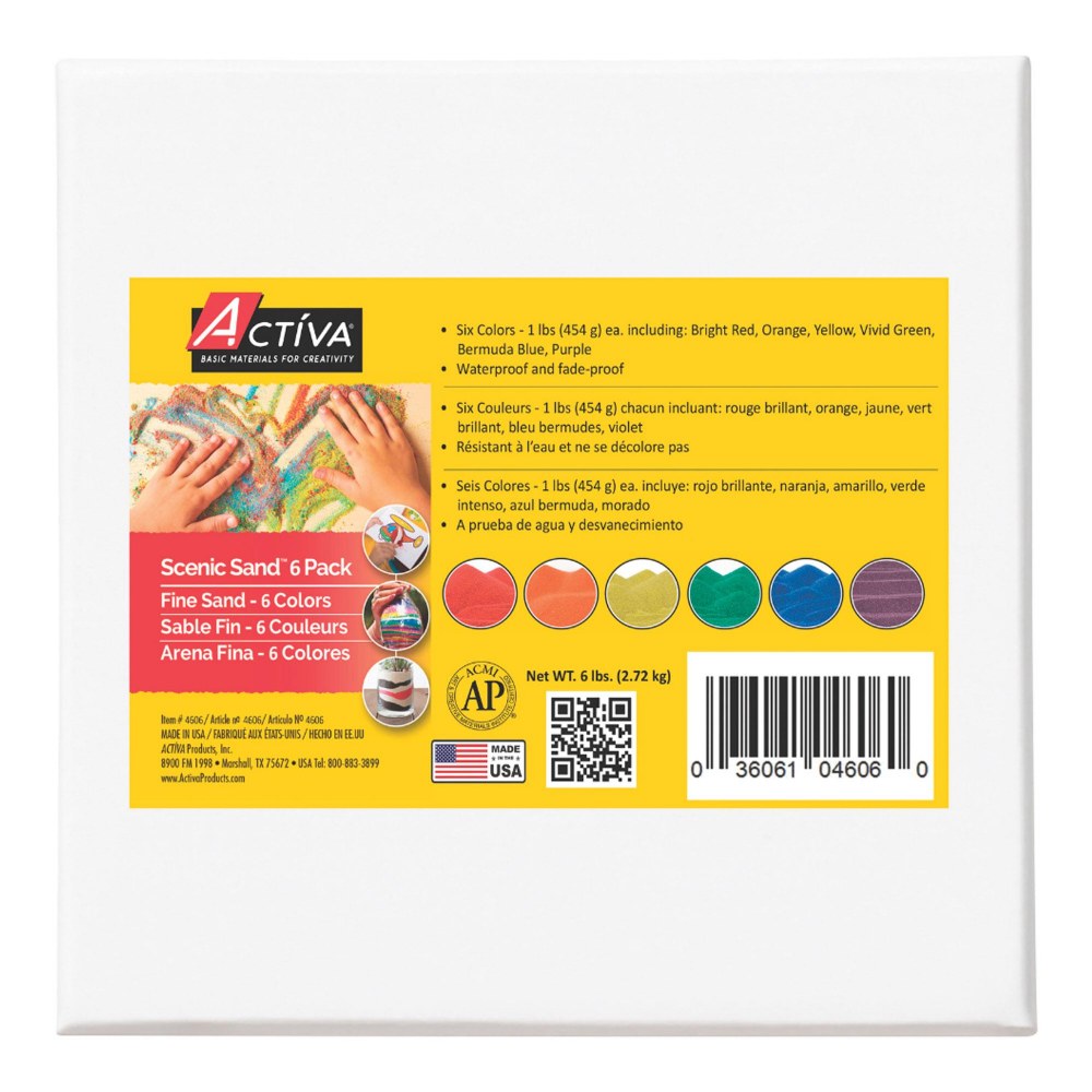 3 years & up. Spark creativity and sensory exploration with the Colored Sand Art Assortment, featuring six one-pound tubs in Bright Red, Orange, Bright Yellow, Vivid Green, Dark Blue, and Purple. The open tub design makes it easy for children to pinch, pour, and sprinkle the sand as they create, supporting fine motor skill development and hand-eye coordination. Activa's colored sand is the only sand approved by ACMI and certified AP Non-Toxic, ensuring safe use in classrooms and activity centers. With enough sand for group projects, this assortment provides hours of colorful, hands-on learning and artistic fun.