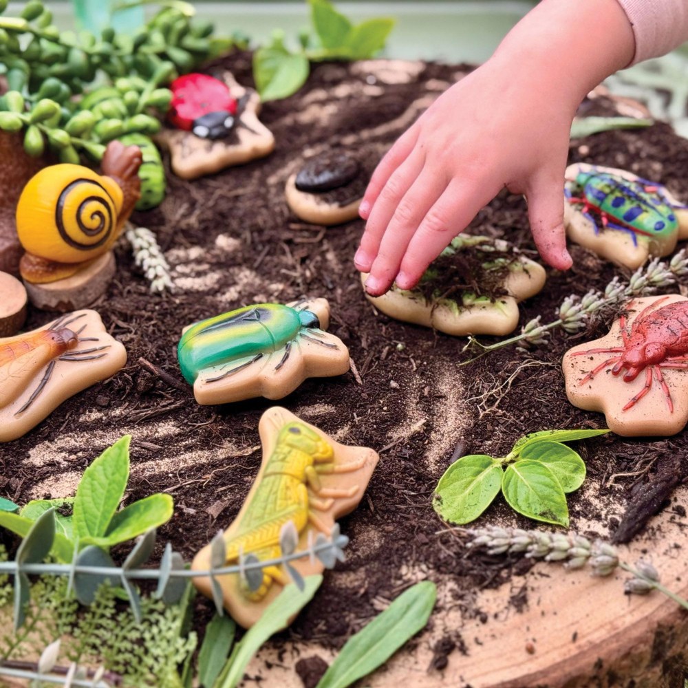 2 years & up. Spark curiosity and imaginative play with this beautifully detailed set of 12 Sensory Play Stones: Bugs. Designed for indoor and outdoor exploration, each tactile stone features realistic textures and engraved details that encourage children to observe, compare, and talk about the fascinating world of bugs. Made from a durable stone mix, these sturdy creatures are perfect for sensory play in mud, sand, moss, or leaves and are easy to clean after every adventure. Children can also press the bugs into playdough to create detailed imprints, supporting hands-on discovery while building vocabulary, observation skills, and an appreciation for the important role bugs play in our environment.
