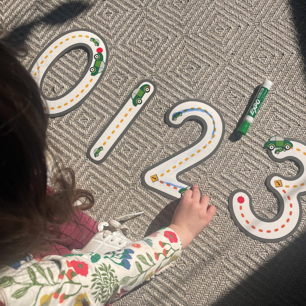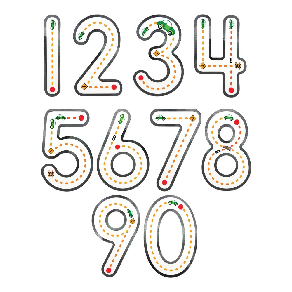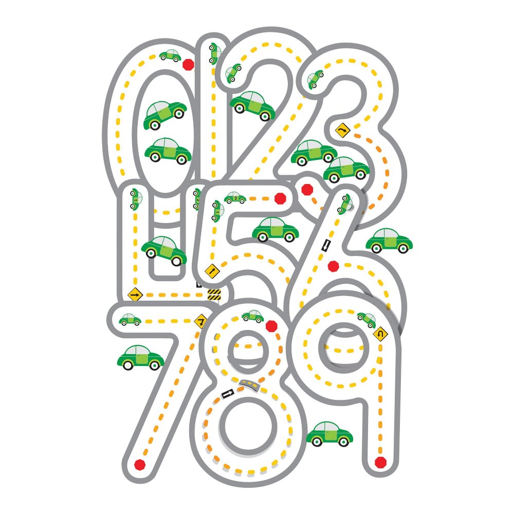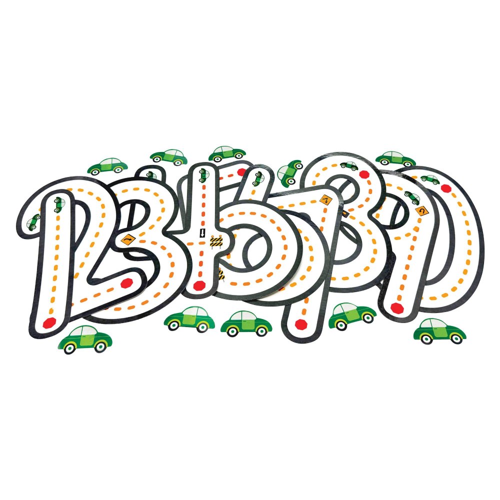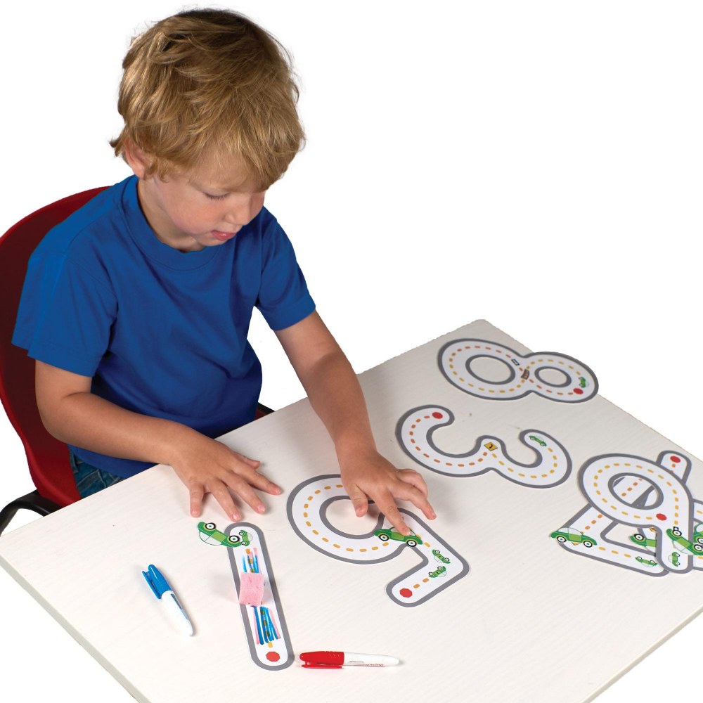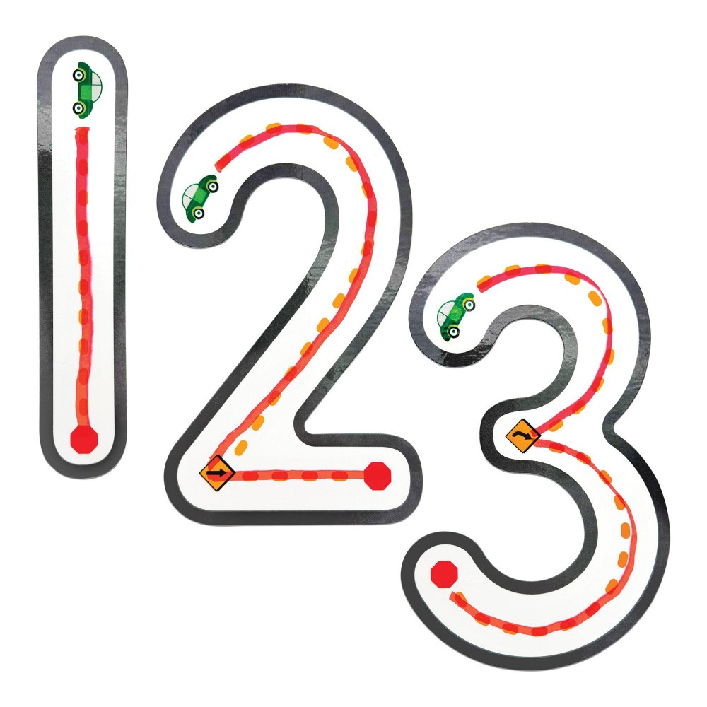 3 years & up. These laminated, write-and-wipe number cards feature a fun road design with a yellow centerline to guide tracing. Children build the motor skills needed for number formation by starting at the green car and following its direction. Trace using a dry erase marker or move the car along the path with a finger. Follow the street signs and stop at the red "stop" mark for correct number writing practice.
