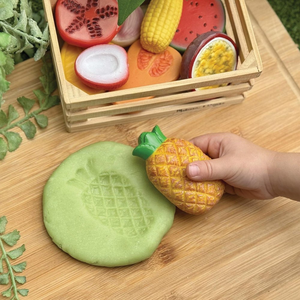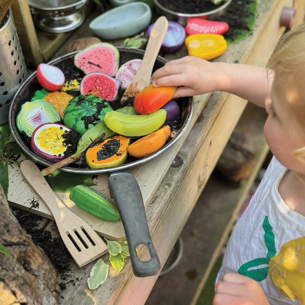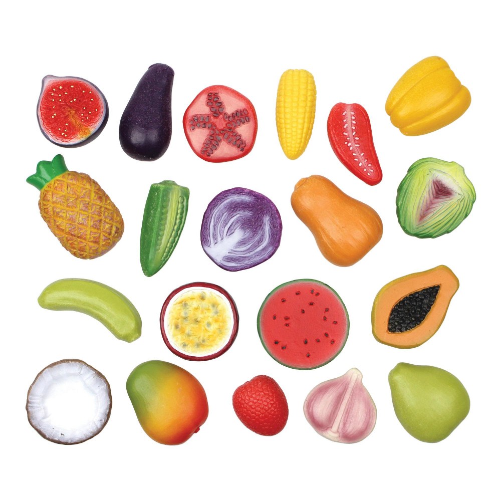 2 years & up. Bring the world of food to life with this set of 20 realistic fruit and vegetable stones, perfect for imaginative play in the home corner, mud kitchen, or role-play market stall. Each durable, tactile stone, from aubergine and baby corn to mango, pineapple, and pomegranate, is designed to spark curiosity as children explore familiar and exotic foods, encouraging descriptive language, counting, and discussions about healthy eating. Washable and hardwearing, these stones are ideal for messy play, whether creating tropical dishes in the mud kitchen or making imprints in playdough, and can be used both indoors and outdoors. Made from a sturdy stone mix, each piece measures 1 3/4" - 3".