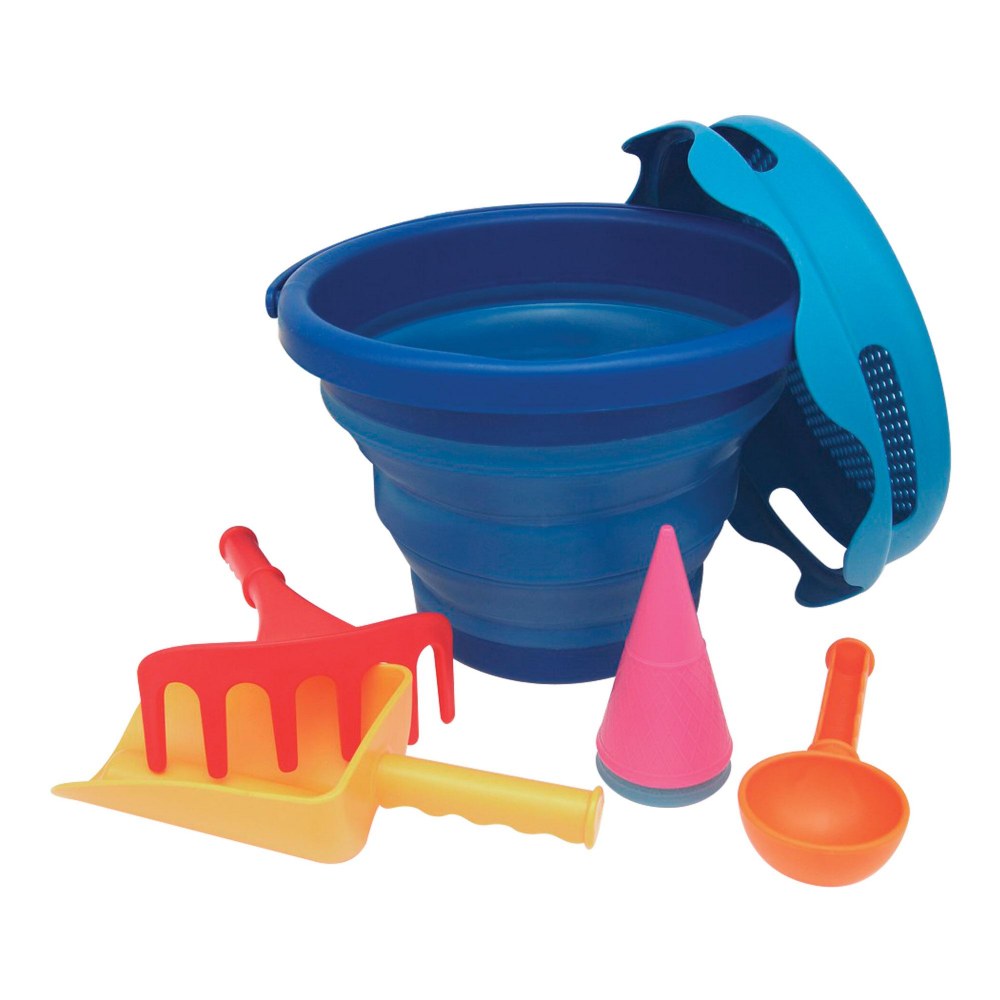 18 months and up. Compact and fun, this 7-piece sand set is perfect for digging, shaping, raking, screening, and transporting sand, building creativity, coordination, and fine motor skills while having hours of outdoor fun. Designed for little hands, it includes a collapsible bucket, sieve, shovel, rake, ice cream scoop, and two ice cream cones. Made from durable, BPA-free plastic. Collapsible bucket stores all pieces together for easy, compact storage.