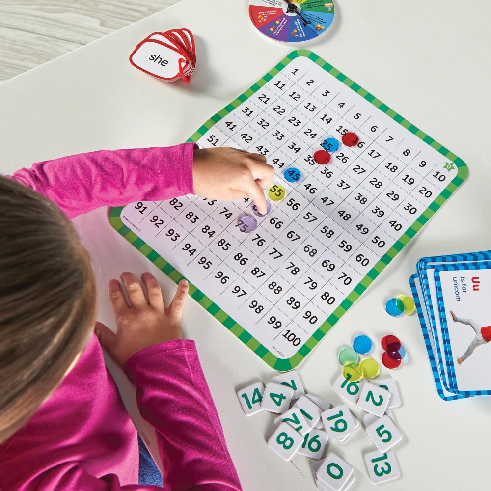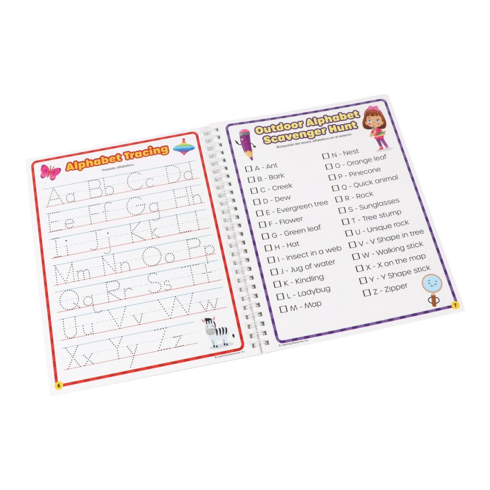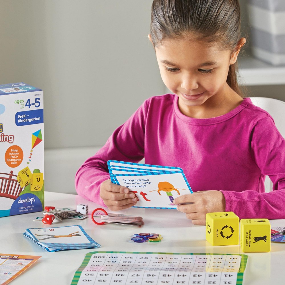 4 years & up. Turn summer into a season of learning adventures! This set helps children prepare for kindergarten with a comprehensive mix of fun, hands-on activities that bridge the gap from preschool to school success. Children build essential skills like letter, number, and color recognition, counting to 100, and early reading and writing. Activities such as alphabet yoga, reading games, and movement prompts keep children active and engaged for both indoors and outside. The set includes write-and-wipe activity book with reading and handwriting practice, plus a summer calendar to track progress and count down to the first day of school. Everything stores neatly in a reusable box for easy cleanup.