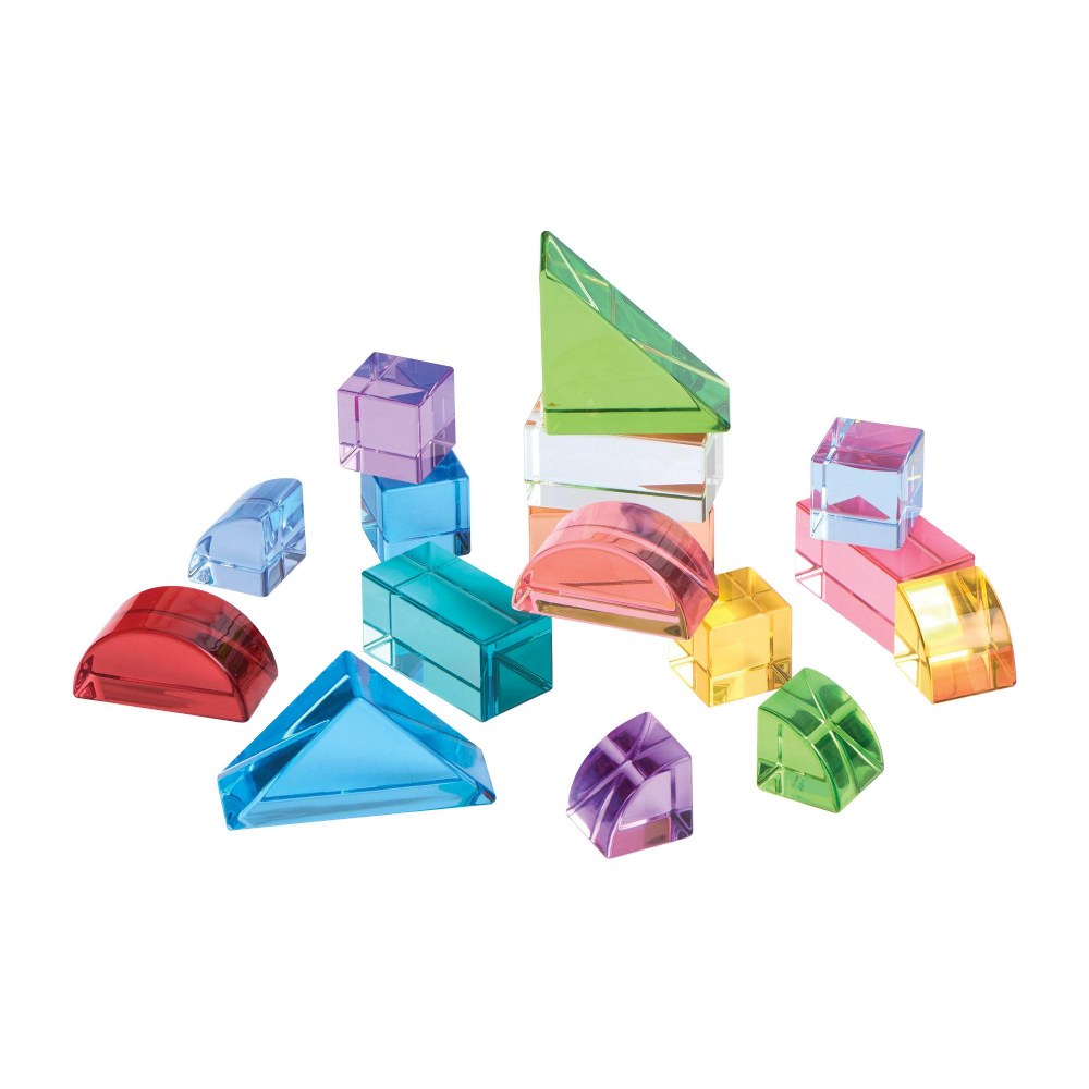 2 years & up. Encourage children to explore structure, color and light while making realistic windows, glowing towers, and colorful architectural builds. Made to align with the same mathematical dimensions as traditional unit blocks, this set of sturdy blocks is crafted from solid, transparent acrylic. Set includes 16 blocks in 10 vibrant colors and 5 unit block aligned shapes to create a completely new play experience.