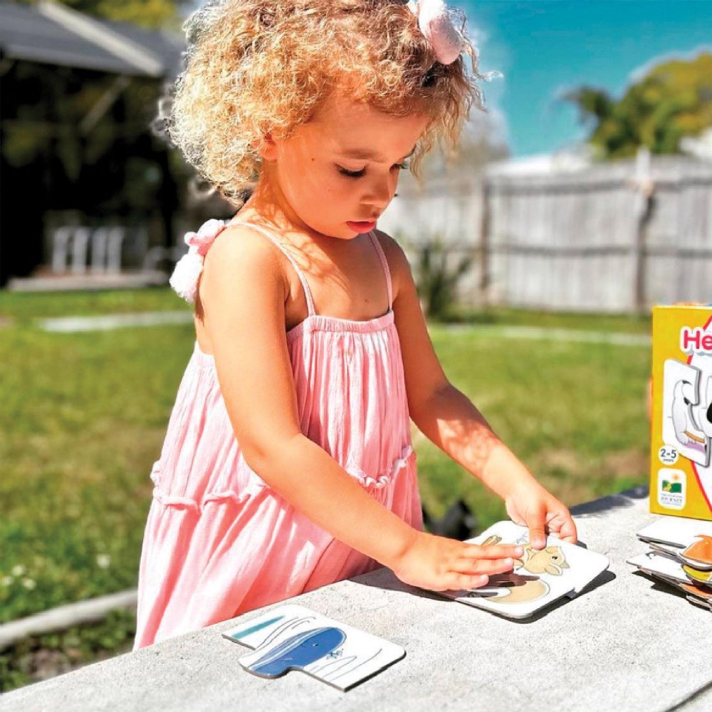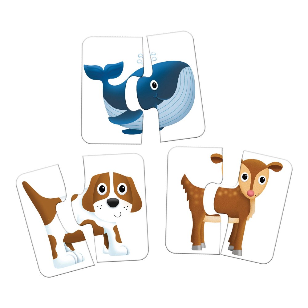 2 years & up. Introduce children to animals with this fun matching game. The set includes 15 animal puzzle cards that feature a picture of an animal's head and tail. A simple match and the puzzle is completed. The puzzles are self-correcting as no two puzzle cuts are the same.