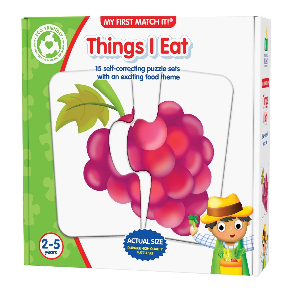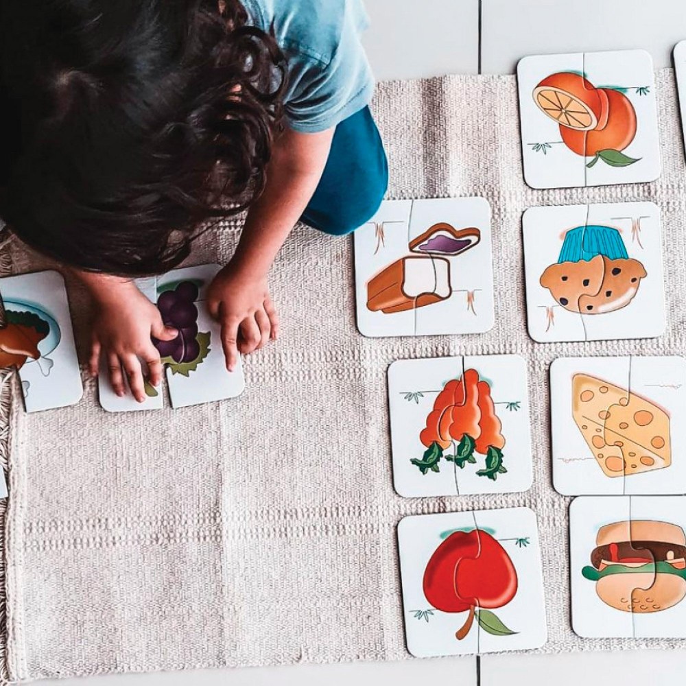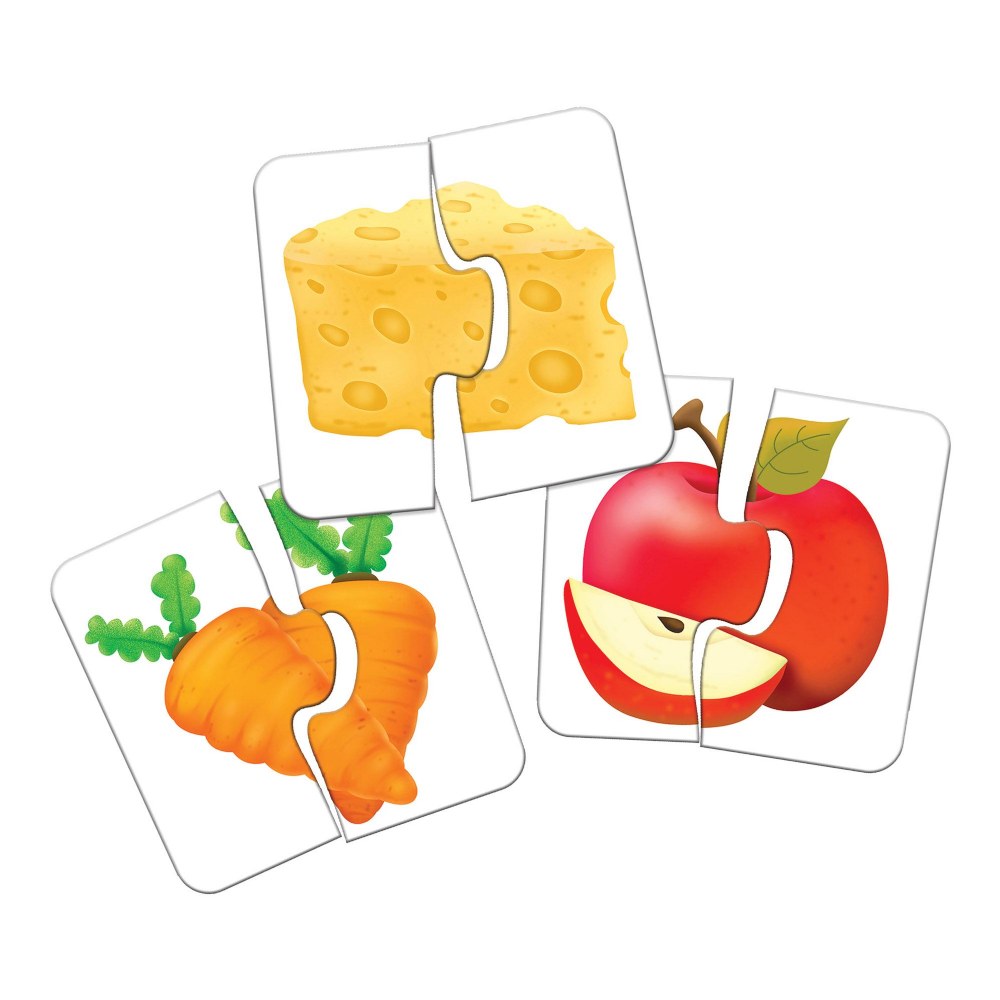 2 years & up. Introduce children to different food groups with this fun matching game. The set includes 15 food themed puzzle cards that feature a familiar food item. A simple match and the puzzle is completed. The puzzles are self-correcting as no two puzzle cuts are the same.