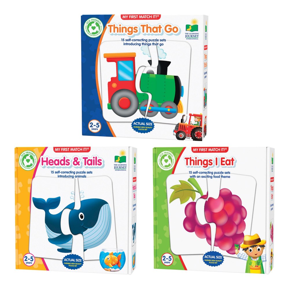 2 years & up. Introduce young children to their first matching puzzle. These simple 2-piece puzzles are easy to match and fun to play. Each puzzle is self-correcting as no two puzzle pieces are the same. The familiar themed puzzles help build language, cognitive, eye-hand coordination and fine motor skills. Each theme includes 15 puzzles to complete.
