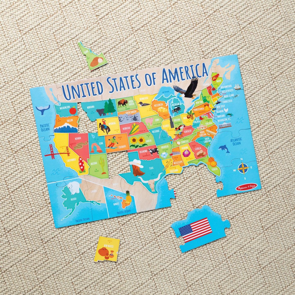 Geography comes to life in this cardboard floor puzzle, featuring 51 pieces cut to the shape of the state or region. 2' x 3' when assembled, the extra-thick pieces are 20% thicker than the competition's. Its easy-clean surface keeps puzzle looking new. Kids will have fun learning the states on this colorful, informative map puzzle.