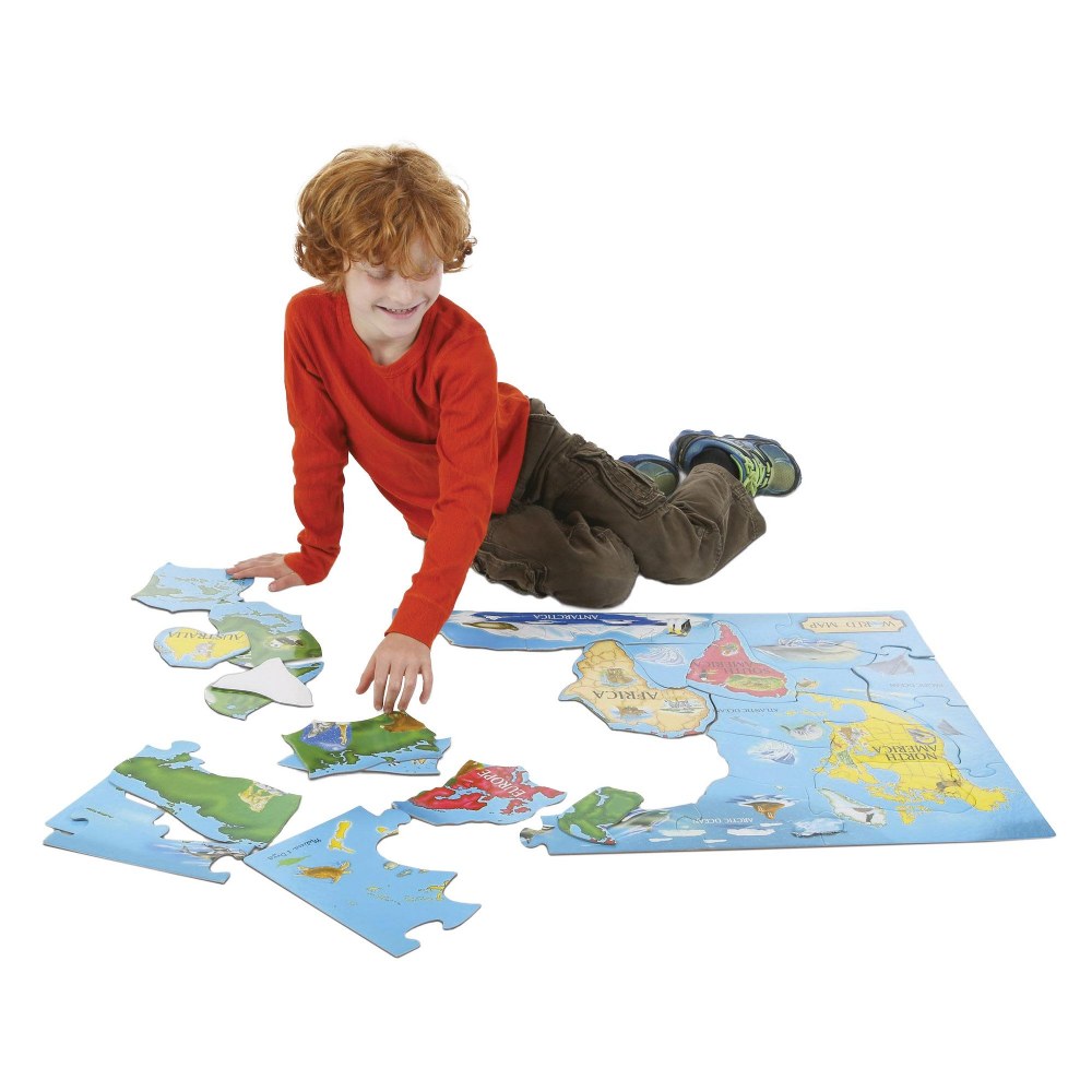 Explore the world with this jumbo-sized; colorful floor puzzle; featuring 33 heavy-grade shape-cut cardboard pieces that are coated on both sides for added durability. Kids will have fun learning world geography on this detailed; educational map puzzle.