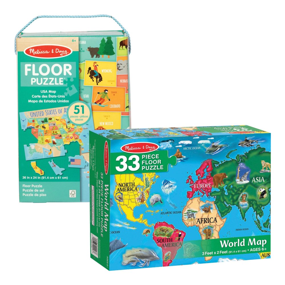 6 years & up. Discover the world and the United States with these floor puzzles. Helps children understand where they live in relationship to the size of their state and the world. Great for introducing Social Studies. World puzzle has 33 pieces and USA puzzle has 51 pieces. Each puzzle measures 24" x 36".