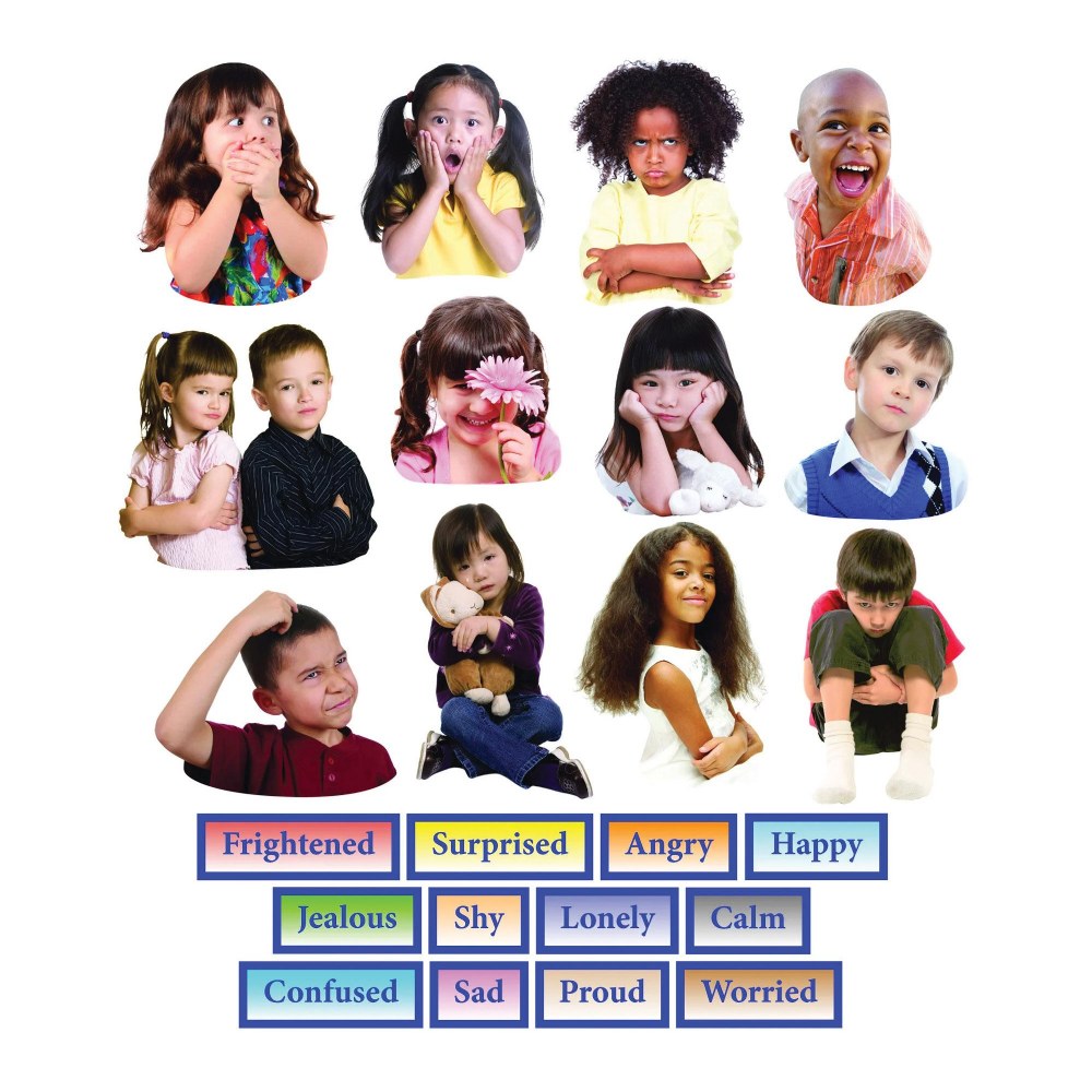 3 years & up. Teaching emotional literacy helps children develop social skills by recognizing and responding to social cues appropriately. Children can interpret their own emotions by matching "feeling" words with pictures. Actual photographs printed on felt. 12 pictures, 12 feeling words, 6 page lesson guide. Average figure 6" tall.