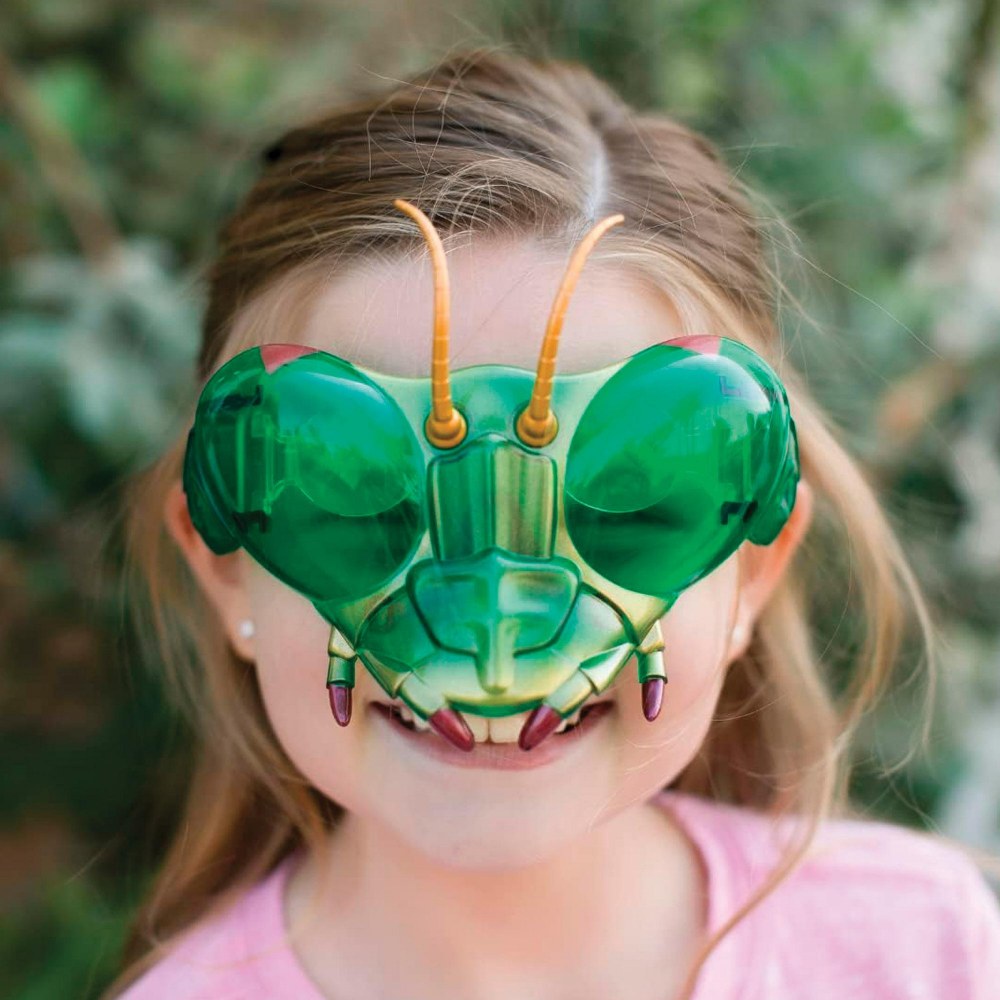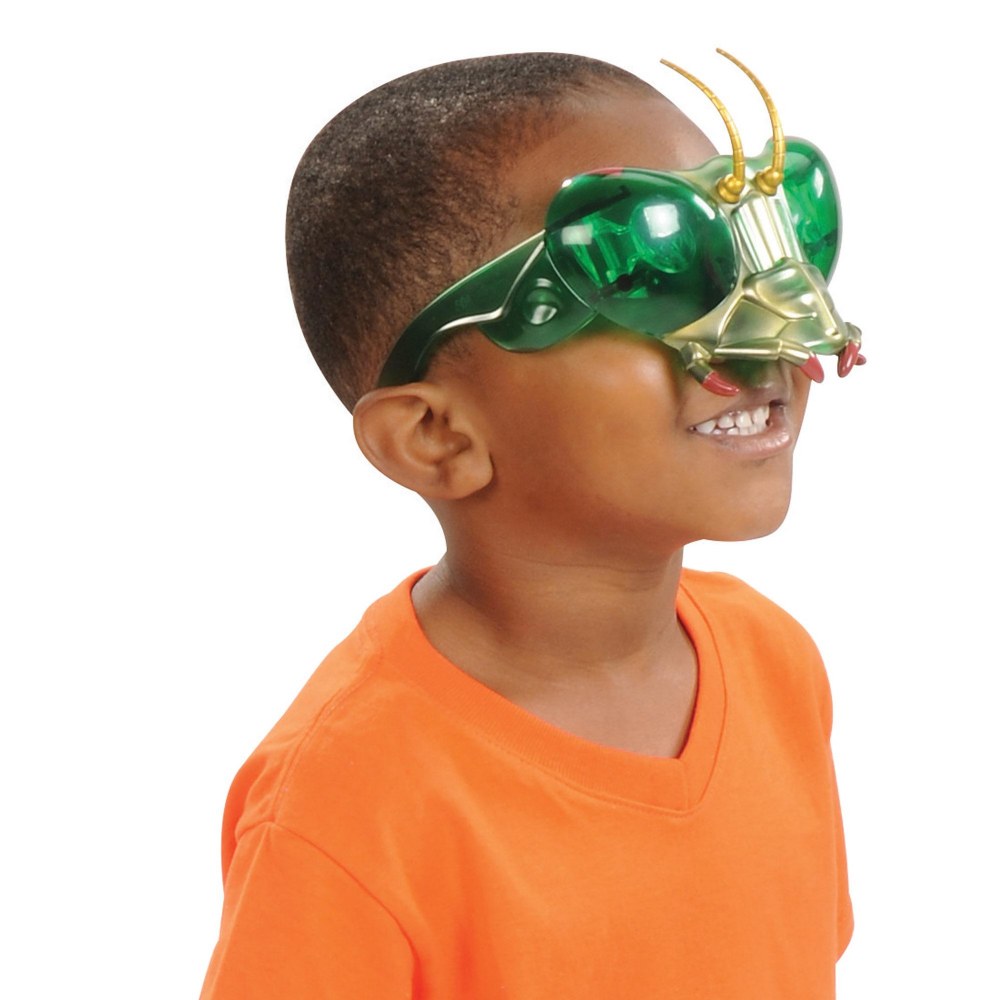 4 years & up. Look like a bug! See like a bug! These unique hinged prismatic glasses let you experience insect sight through compound eyes. Flip the lenses back when you want a clear-eyed view. Bug Goggles Buzzerks® Praying Mantis eyewear portrays super realistic insect detail. Features antennae, mandibles and legs that double as earpieces Made of durable plastic and measure approximately 4" x 5" by 3.5". Colors may vary.