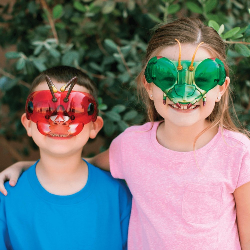 4 years & up. Look like a bug! See like a bug! These unique hinged prismatic glasses let you experience insect sight through compound eyes. Flip the lenses back when you want a clear-eyed view. Each set includes praying mantis and ant style glasses. Glasses are easy to clean, just wipe with a cloth and go! Colors may vary.