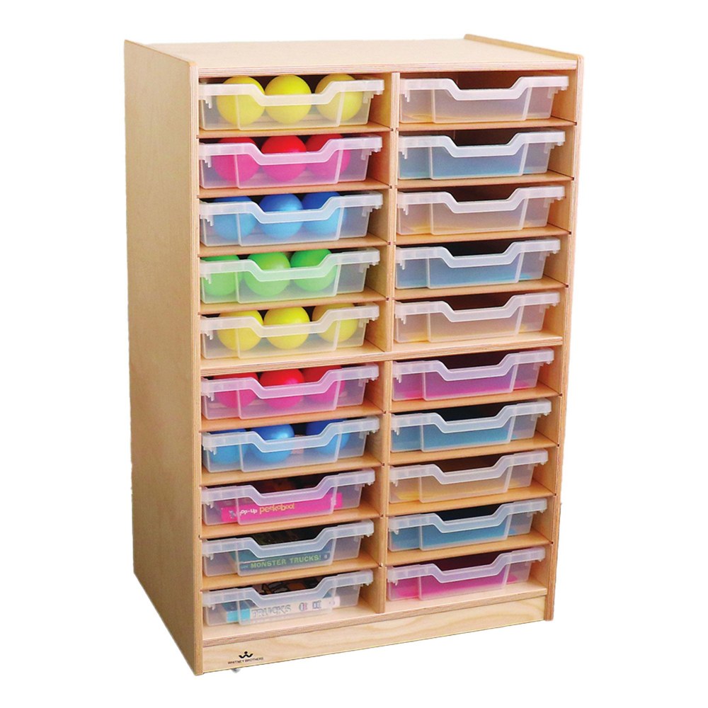 A friendly welcome and sign-in center area for parents to access information. There are twenty 3" deep trays with a space to write each child's name. Easy to clean and resists scratches with full rounded corners. Fully assembled (just attach casters). Measures 27"W x 18"D x 42"H.