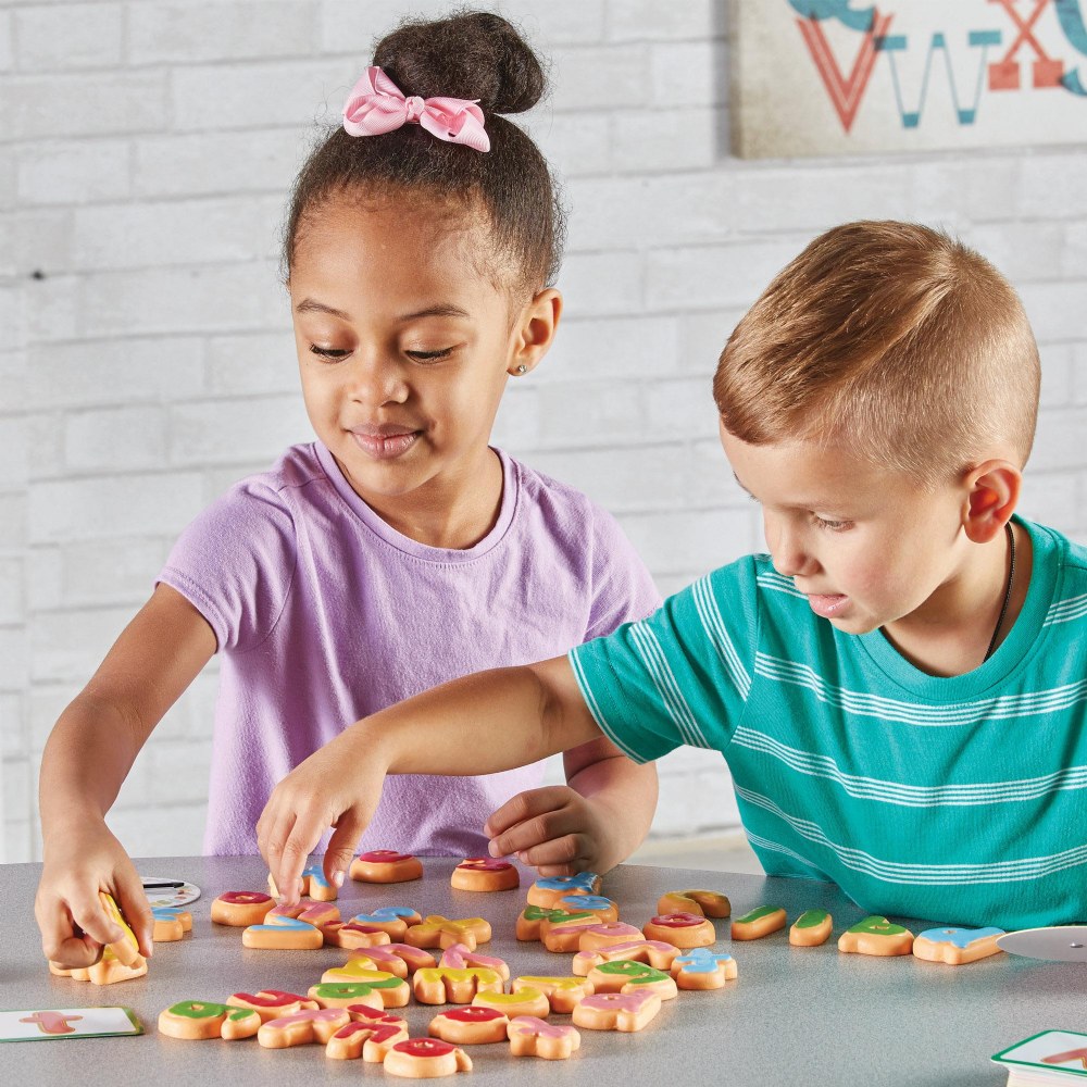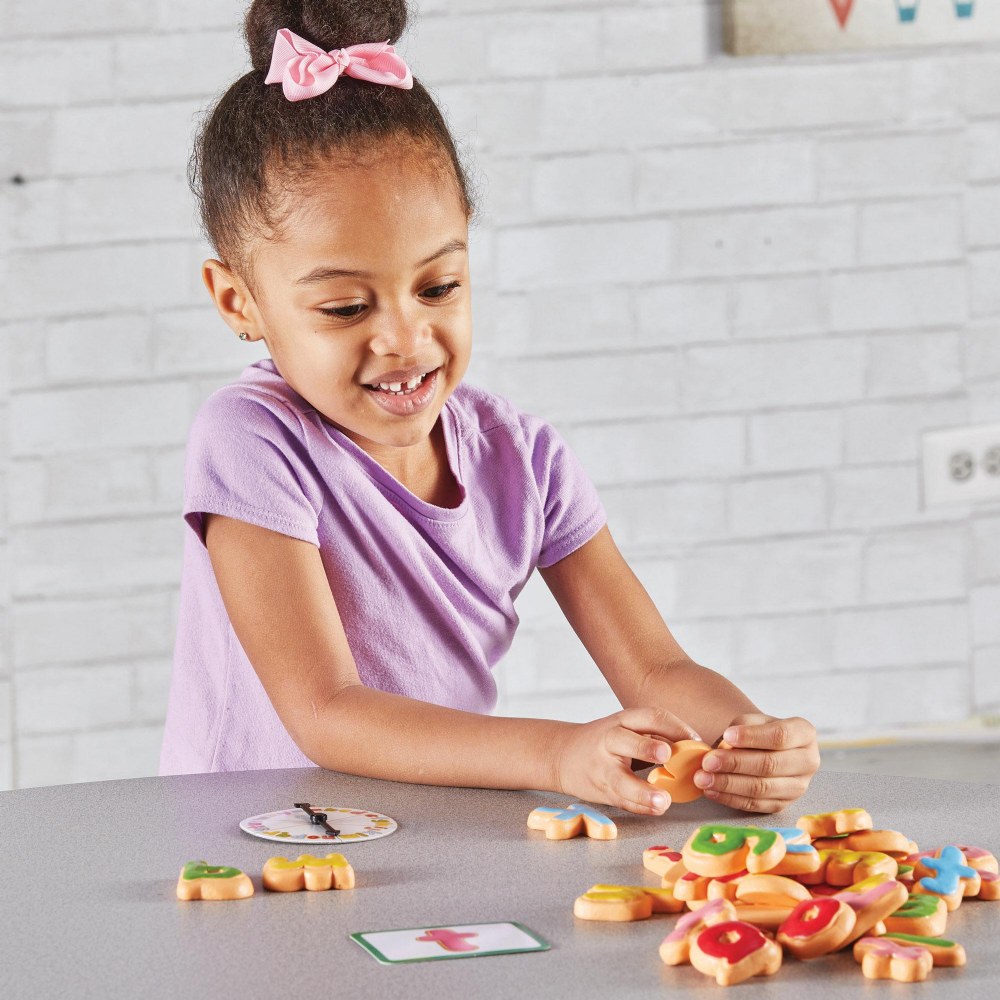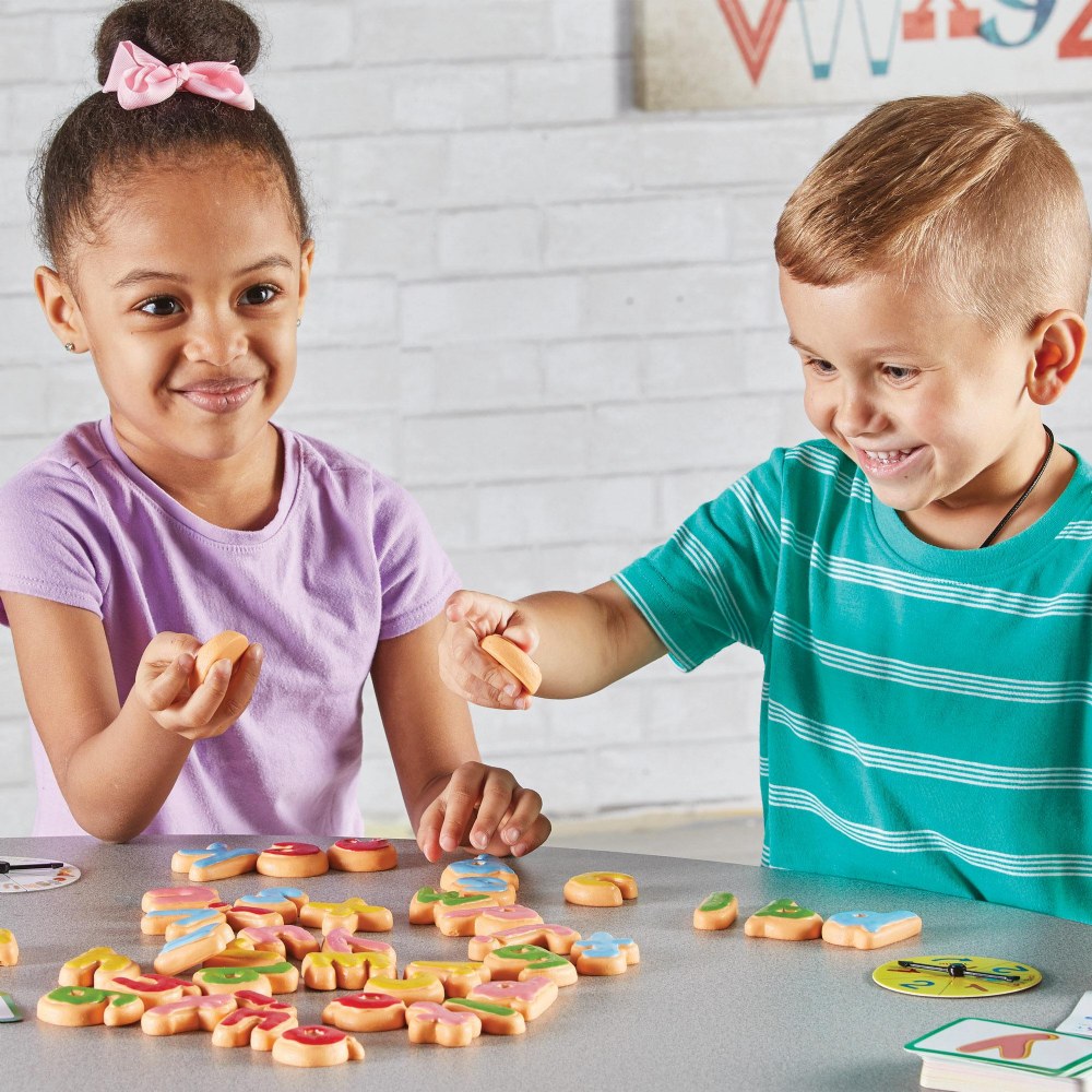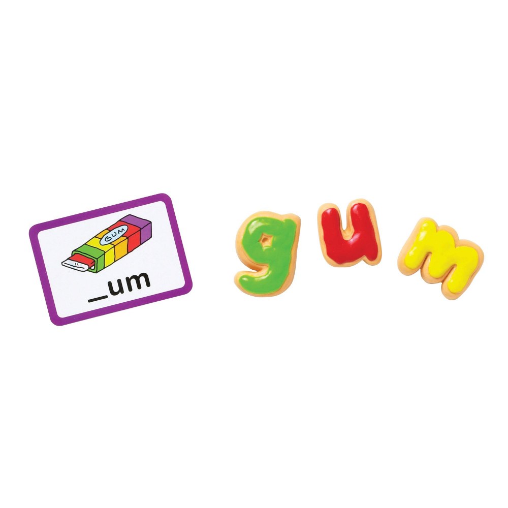 3 years & up. Turn early literacy into a sweet learning adventure with this playful ABC cookie game set. Children practice letter recognition, beginning sounds, CVC word building, and early vocabulary as they spin, match, and build simple words using the alphabet shaped "cookie" pieces. Picture cues, bright card borders, and color-coded red vowels guide emerging readers while keeping learning fun and engaging. Includes 45 double-sided cards, 2 spinners, and 42 lowercase alphabet cookies (approximately 2"). A resealable jar keeps all the pieces neatly stored. Game guide includes four ways to play. For 2-4 players.