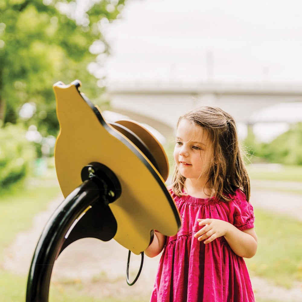 Age: 2-12 years; Size: 13.69"W x 40.81"H x 13"D; In Ground or Wall Mount. Made out of Anodized Aluminum. Includes 1 Mallet. Tonal quality is bright and clear.